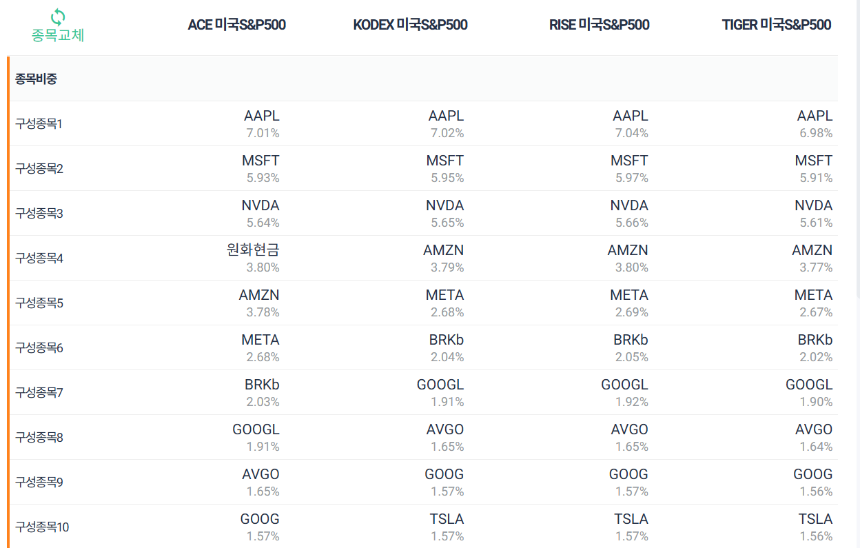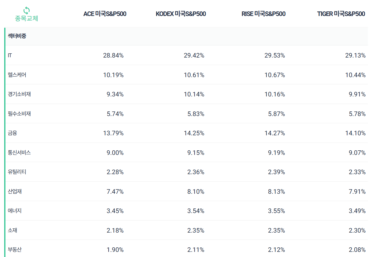 미국S&P500 ETF 종류별 구성종목 10개, 섹터비중은 11가지로 구성되어 있으며 운용사별로 큰 차이는 없는 것으로 보입니다.
