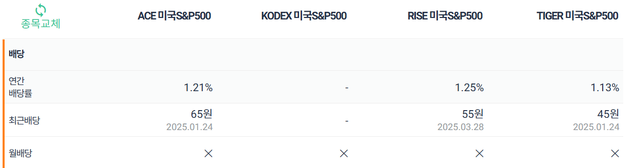 TIGER 미국S&P500 2. ETF별 배당률 비교
