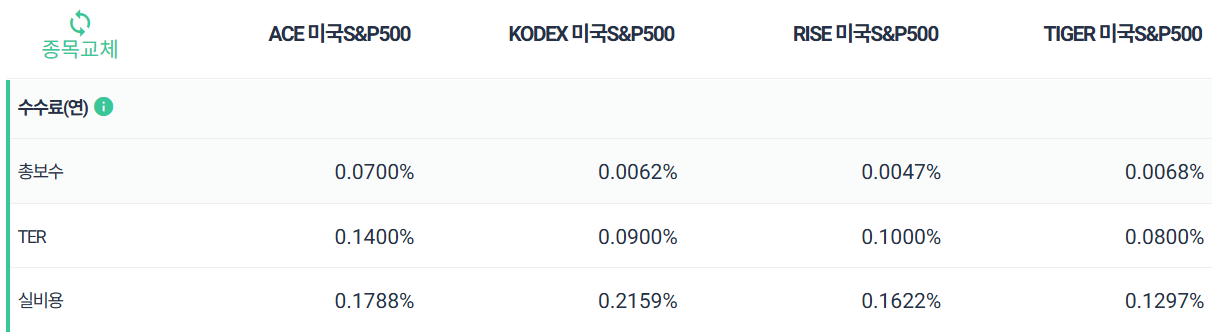 TIGER 미국S&P500 (0.1297%) > RISE 미국S&P500 (0.1622%) > ACE 미국S&P500 (0.1788%) > KODEX 미국S&P500 (0.2159%)
