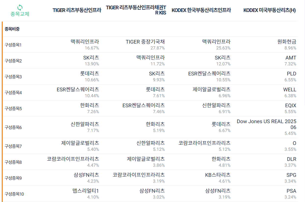 KODEX 한국부동산리츠인프라(9.3%) > TIGER 리츠부동산인프라 (7.6%) > TIGER 리츠부동산인프라채권TR KIS(5.16%) > KODEX 미국부동산리츠(H) (4.42%)