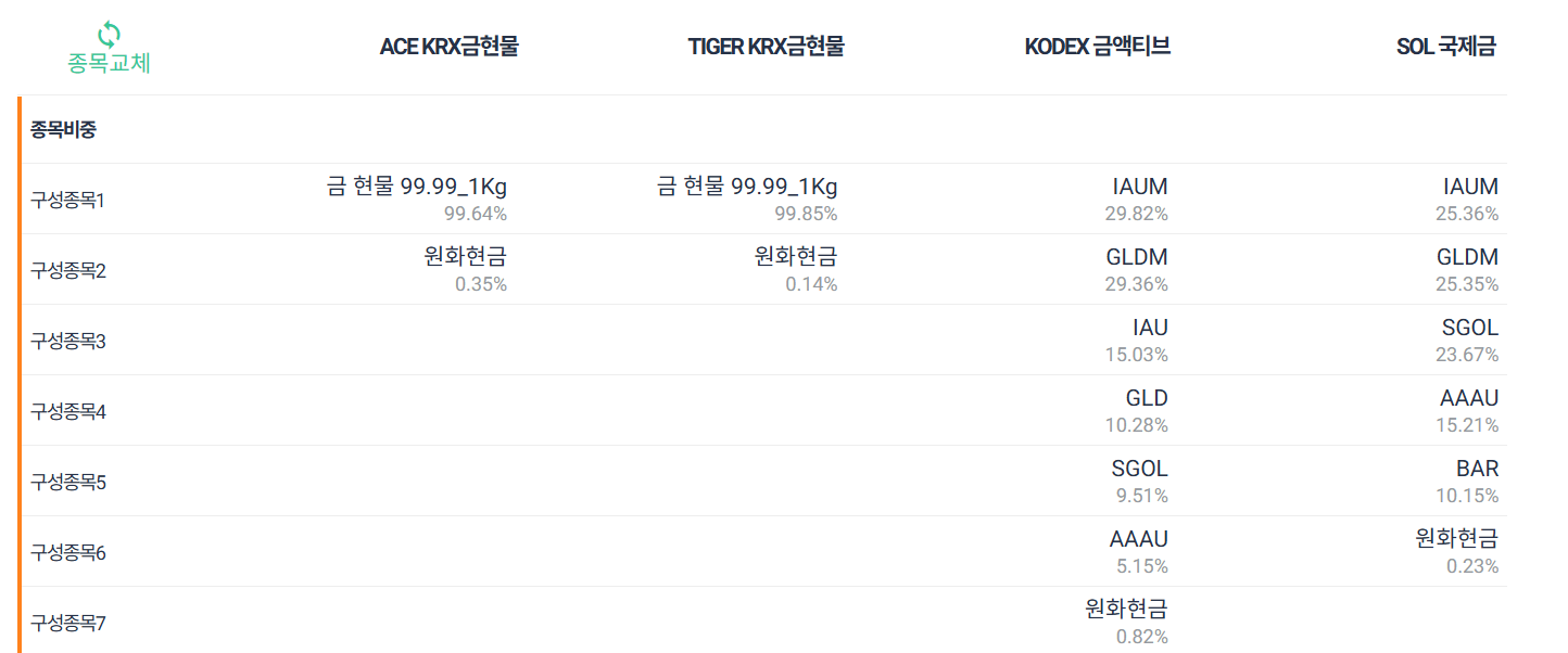 금 ETF 종류별 구성종목은 아래와 같으며 국내 KRX 금현물 시장 금 가격을 추종하는 ACE , TIGER KRX 금현물 ETF는 동일한 금 현물을 Main 비중을 두고 있으며 국제금 가격을 추종하는 KODEX 금액티브, SOL 국제금은 아래와 같은 종목으로 구성되어 있습니다.