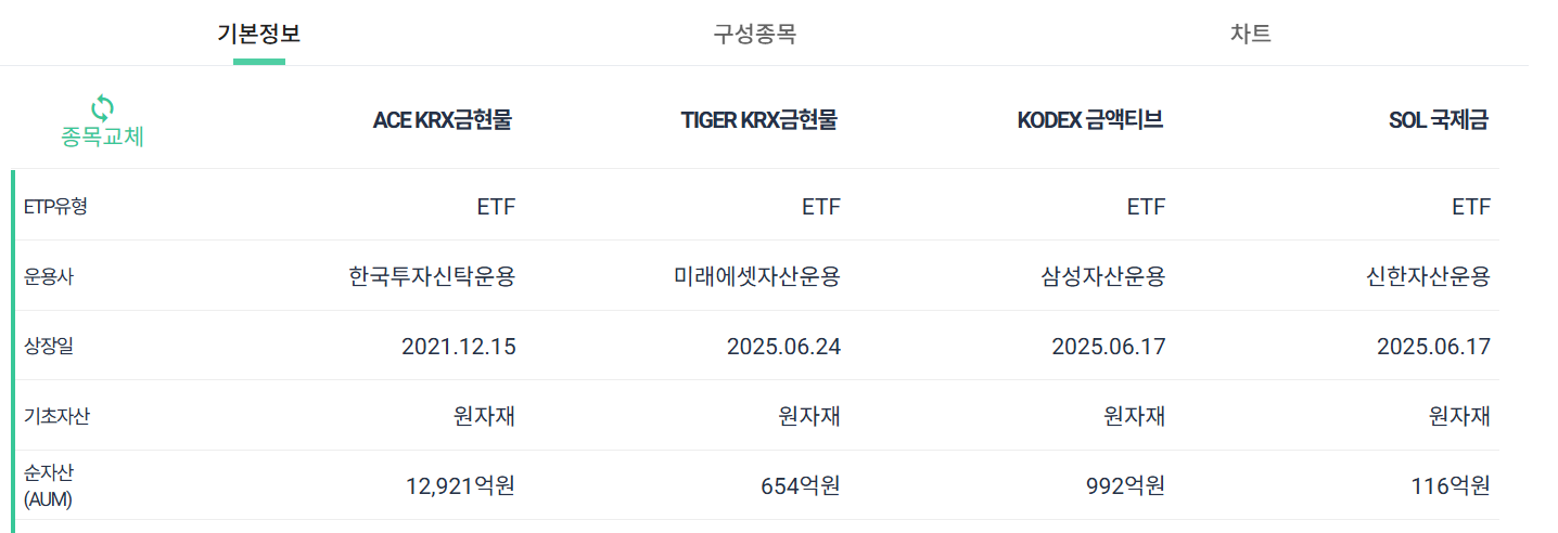 KODEX 금액티브 (0.38%) = SOL 국제금 (0.39%) = TIGER KRX 금현물 (0.40%) > ACE KRX 금현물 (0.79%)
