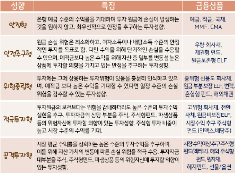 - 안정형 투자자들은 시중은행 예적금이나 국채 혹은 단기금융상품 (CMA, MMF) 등이 적합