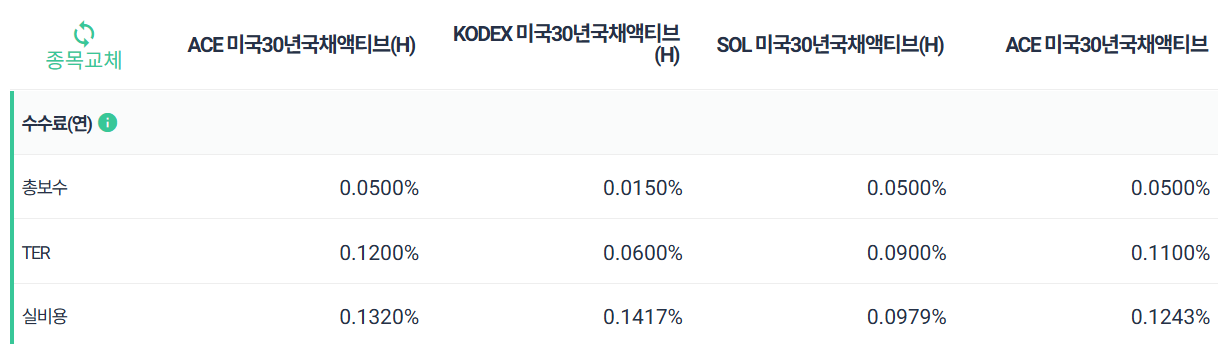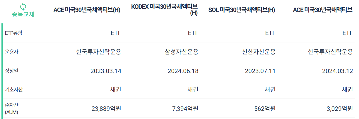 SOL 미국30년 국채액티브(H) (0.0979%) > ACE 미국30년 국채액티브 (0.1243%) > ACE 미국30년 국채액티브(H)(0.132%) KODEX 미국30년 국채액티브 (0.1417%)