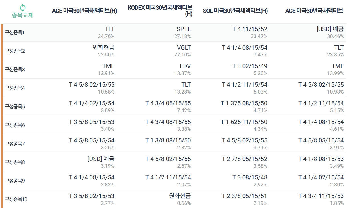 미국30년국채액티브 ETF 종류별로 크게 구성종목 10개 구성되어 있으며 운용사별로 큰 차이는 없는 것으로 보입니다.
