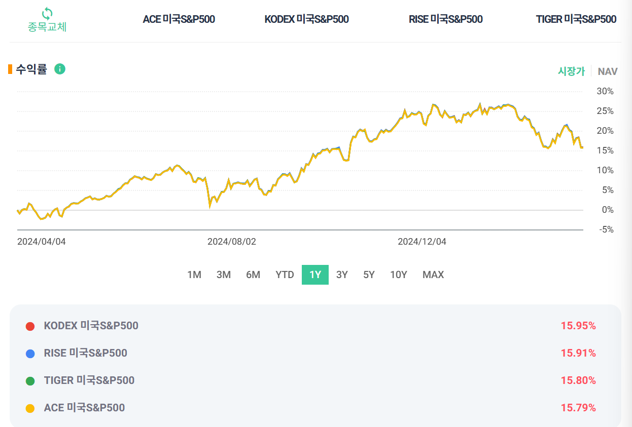KODEX 미국S&P500 (15.95%) > RISE 미국S&P500 (15.91%)> TIGER 미국S&P500 (15.8%) > ACE 미국S&P500 (15.79%)
