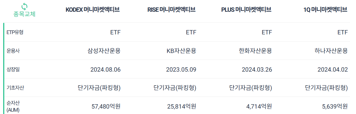 1Q(하나) 머니마켓액티브(3.85%) = RISE 머니마켓액티브 (3.75%) = PLUS 머니마켓액티브 (3.74%) > KODEX 머니마켓액티브 (2.47%) (24년 8월 상장)