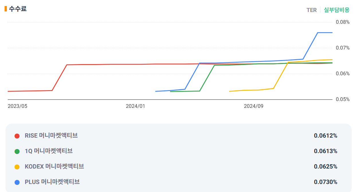 RISE 머니마켓액티브 (0.0612%) = 1Q(하나) 머니마켓액티브 (0.0613%) = KODEX 머니마켓액티브 (0.0625%) > PLUS 머니마켓액티브(0.073%)