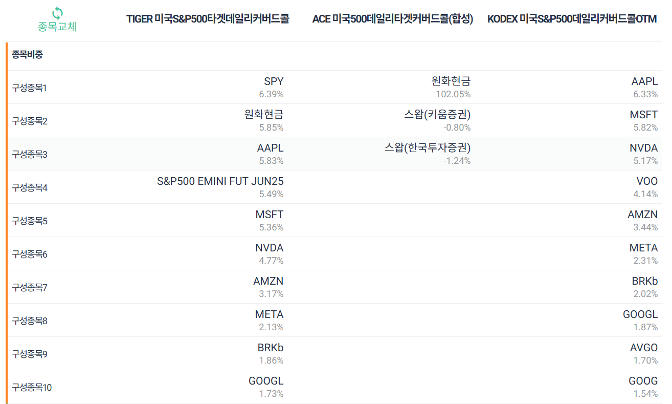 ACE 미국500데일리타겟커버드콜(합성)(17.39%) >TIGER 미국S&P500타겟데일리커버드콜 (9.35%) > KODEX 미국S&P500데일리커버드콜OTM (3.83%)