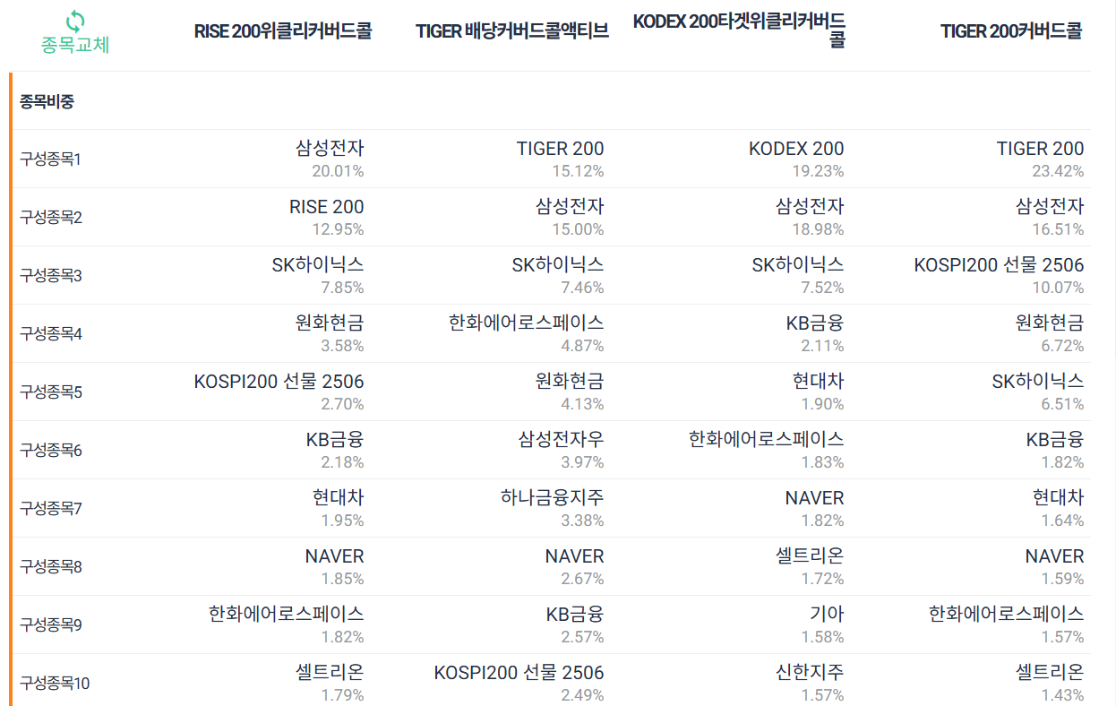 KOSPI200 커버드콜 ETF 종류별 구성종목과 섹터비중은 아래와 같습니다.
