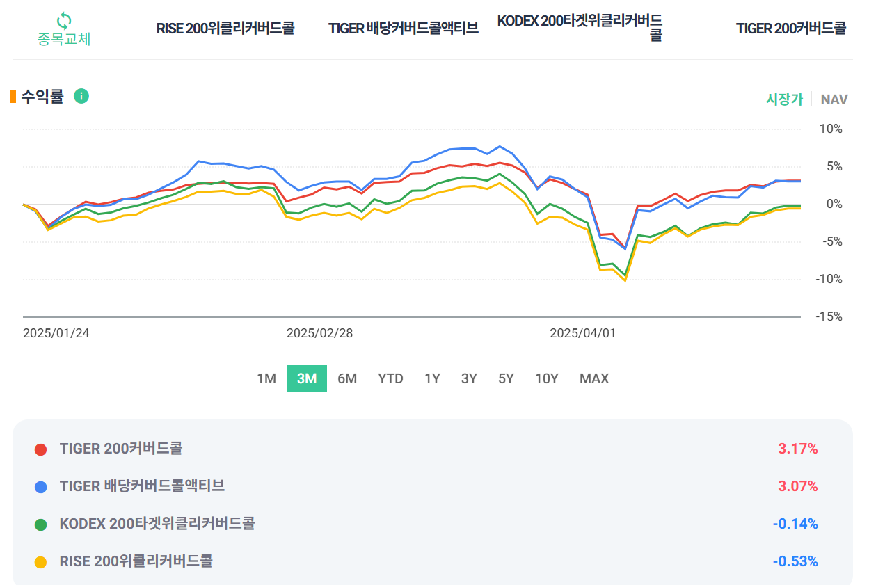 TIGER 200커버드콜 (3.17%)>TIGER 배당커버드콜액티브(3.07%) >KODEX 200 타겟위클리커버드콜 (-0.14%)> RISE 200위클리커버드콜(-0.53%)
