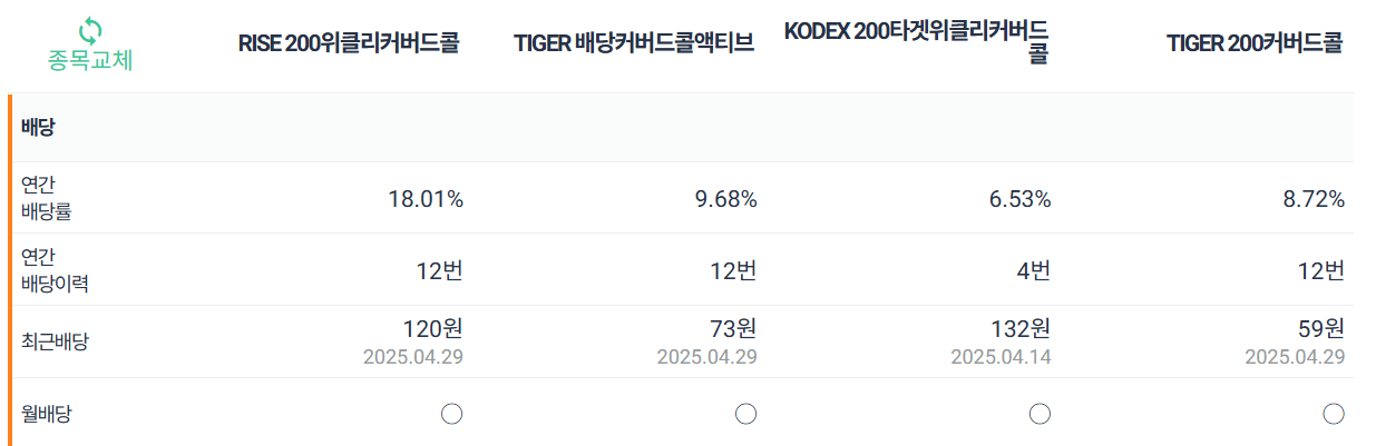 KODEX 200 타겟위클리커버드콜 (1.35%) > TIGER 200커버드콜 (0.97%)>TIGER 배당커버드콜액티브(0.63%) > RISE 200위클리커버드콜(-7.44%)