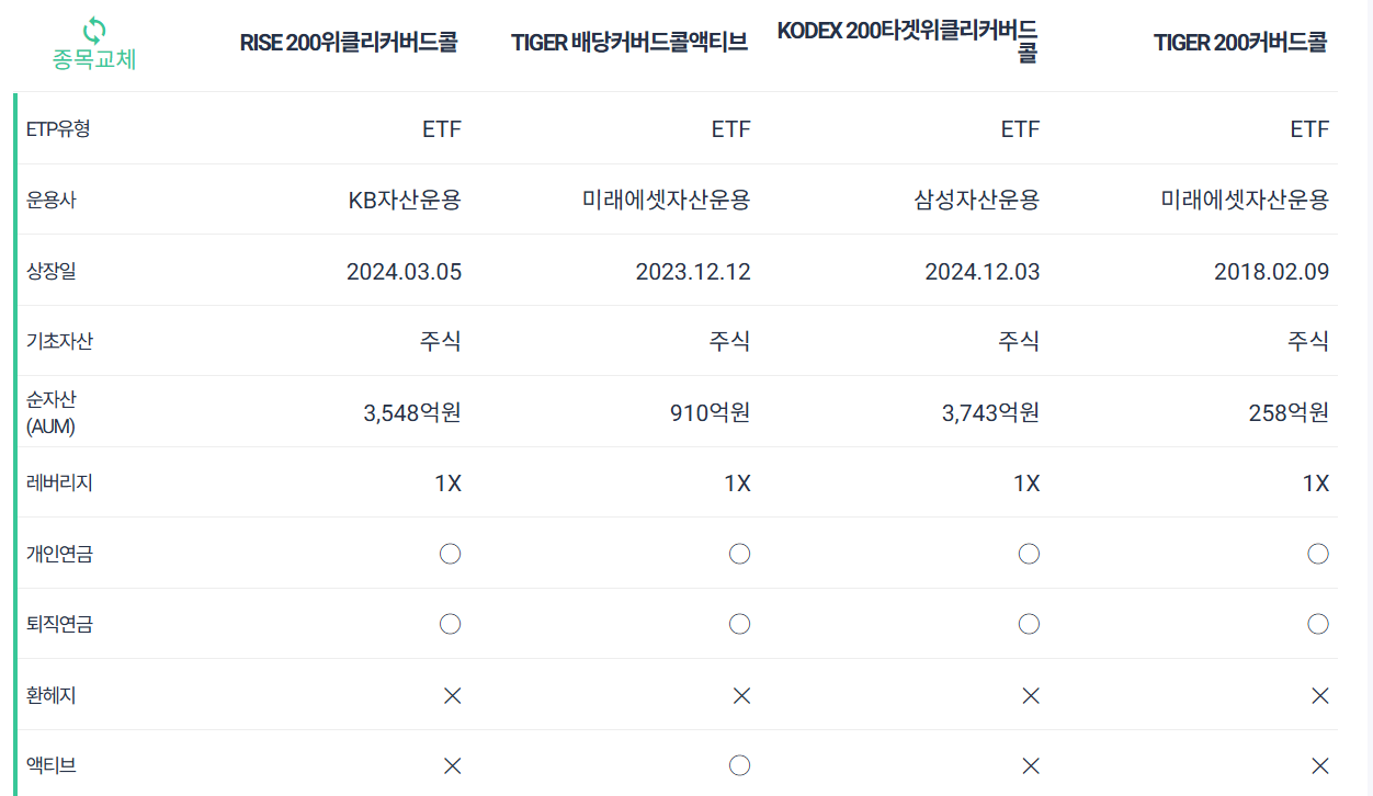 RISE 200위클리커버드콜(0.42%) > KODEX 200 타겟위클리커버드콜 (0.43%) > TIGER 200커버드콜 (0.49%) > TIGER 배당커버드콜액티브(0.54%)