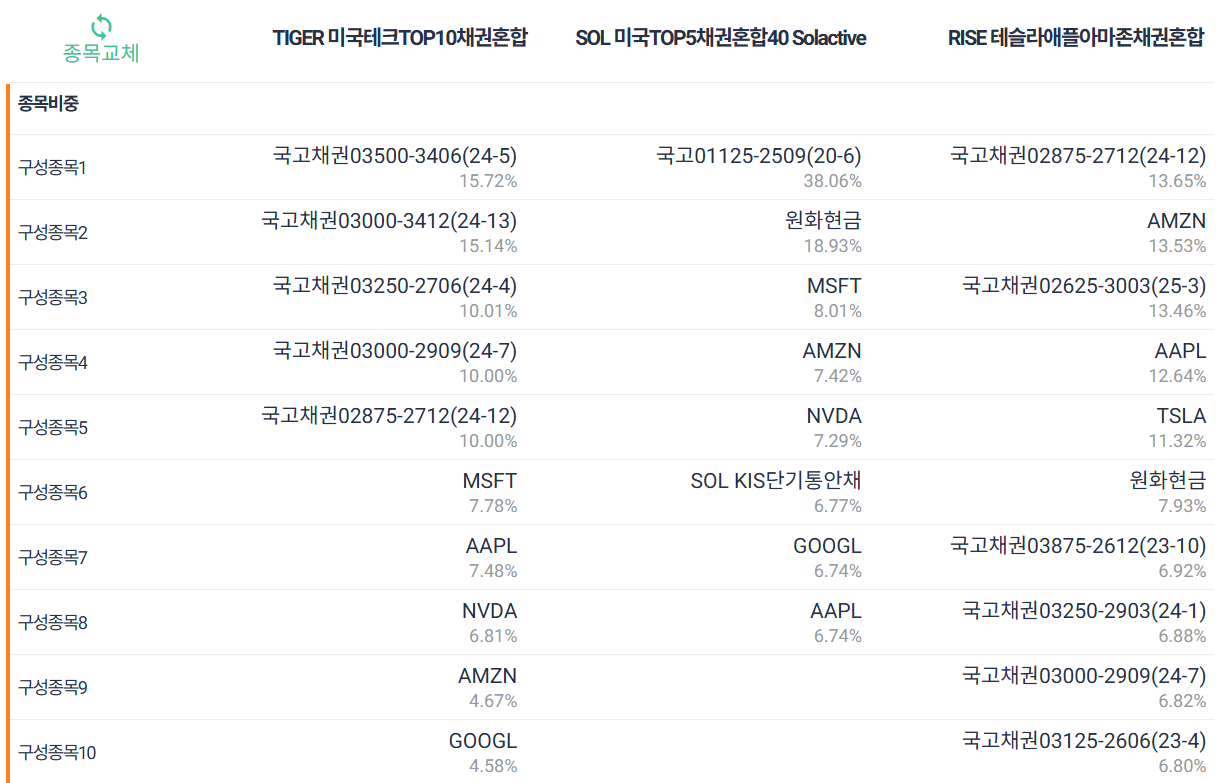 SOL미국TOP5채권혼합40Solactive(0.35%)> TIGER미국테크TOP10채권혼합(0.39%) > RISE테슬라애플아마존채권혼합 (0.48%)