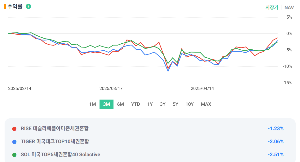 RISE테슬라애플아마존채권혼합 (-1.2%) > TIGER미국테크TOP10채권혼합(-.2.0%)> SOL미국TOP5채권혼합40Solactive (-2.5%)
